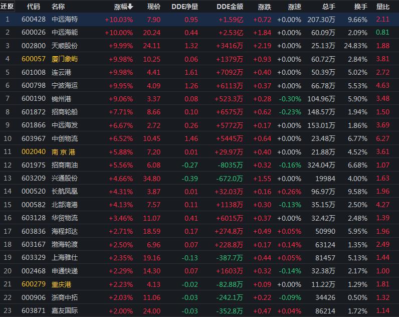 具體來(lái)看,交通運(yùn)輸板塊中,連云港、天順股份、廈門象嶼、中遠(yuǎn)海特、中遠(yuǎn)海能、寧波海運(yùn)等6只概念股集體漲停。