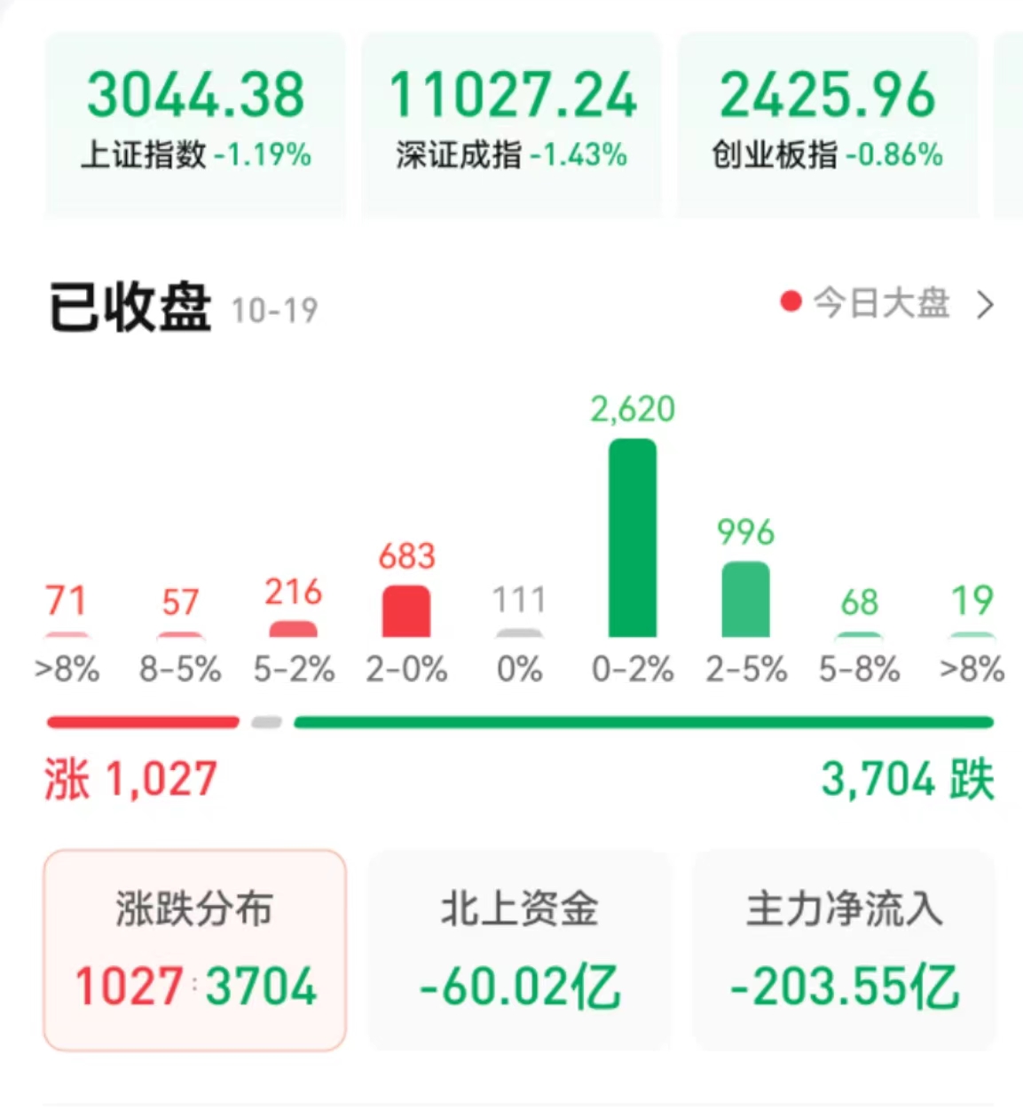 周三,A股三大股指震蕩回落,全線飄綠。截至收盤,上證指數(shù)跌1.19%報(bào)3044.38點(diǎn),深證成指跌1.43%報(bào)11027.24點(diǎn),創(chuàng)業(yè)板指跌0.86%報(bào)2425.96點(diǎn);兩市合計(jì)成交7584億元,北向資金凈賣出60.02億元。總體來(lái)看,A股個(gè)股跌多漲少。震蕩整理中A股將何去何從?后市的投資機(jī)會(huì)在哪里?
