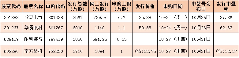 下周將有4只新股發(fā)行,其中,科創(chuàng)板1家,創(chuàng)業(yè)板2家,上交所主板1家,累計(jì)發(fā)行數(shù)量共計(jì)約1.33億股,預(yù)計(jì)募集資金26.39億元。具體看,10月24日發(fā)行的是欣靈電氣、華廈眼科,10月27日發(fā)行的是耐科裝備、南方路機(jī)。