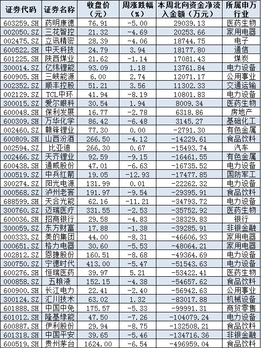 資金方面,周五,北向資金全天單邊凈賣出89.23億元,創(chuàng)8月23日以來新高;本周5個(gè)交易日北向資金連續(xù)減倉,累計(jì)凈流出金額達(dá)293.3億元,創(chuàng)逾7個(gè)月新高。從前十大成交活躍股來看,本周,藥明康德、三花智控等2只個(gè)股,北向資金凈買入金額均超2億元。另外,貴州茅臺(tái)、中國平安、伊利股份、隆基綠能等個(gè)股遭北向資金凈賣出金額均超10億元。