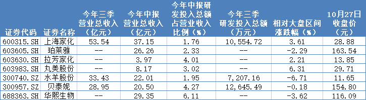 截至10月27日收盤,上述7家公司中,已經(jīng)有3家披露三季報(bào),2家公司實(shí)現(xiàn)營(yíng)業(yè)收入同比增長(zhǎng);另有1家公司披露了業(yè)績(jī)預(yù)喜的預(yù)告。貝泰妮業(yè)績(jī)尤其突出,前三季度實(shí)現(xiàn)營(yíng)業(yè)收入37.05%及歸母凈利潤(rùn)45.62%的同比增長(zhǎng)。