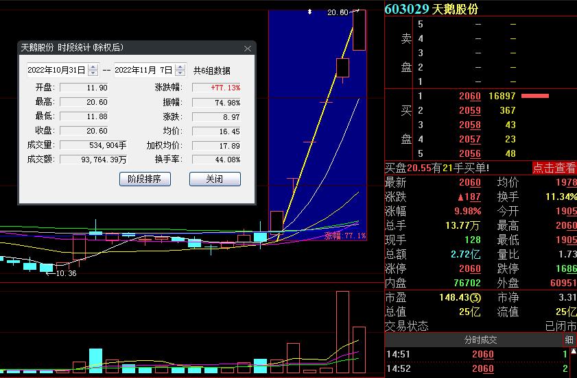 11月7日,熱門股天鵝股份再度漲停,截至收盤,報(bào)20.60元,連續(xù)6個(gè)交易日漲停,累計(jì)漲幅達(dá)77.13%。