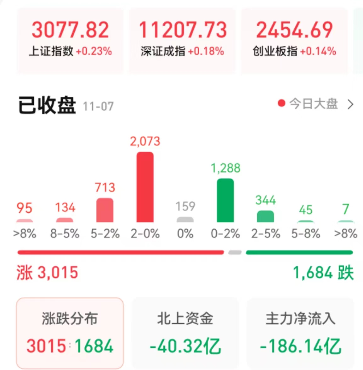 周一(11月7日),A股三大指數(shù)集體收漲,均走出六連陽(yáng)的態(tài)勢(shì)。截至收盤,上證指數(shù)漲0.23%報(bào)3077.82點(diǎn),深證成指漲0.18%報(bào)11207.73點(diǎn),創(chuàng)業(yè)板指漲0.14%報(bào)2454.69點(diǎn);兩市合計(jì)成交10061億元,連續(xù)第2個(gè)交易日突破萬(wàn)億元;北向資金凈賣出40.32億元;總體來(lái)看,A股個(gè)股漲多跌少,