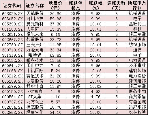 表:連續(xù)上漲5日且今日收盤漲停個(gè)股情況: