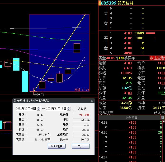 11月8日,熱門股晨光新材再度漲停,截至收盤,報(bào)41.03元,連續(xù)7個(gè)交易日上漲,累計(jì)漲幅達(dá)31.93%。