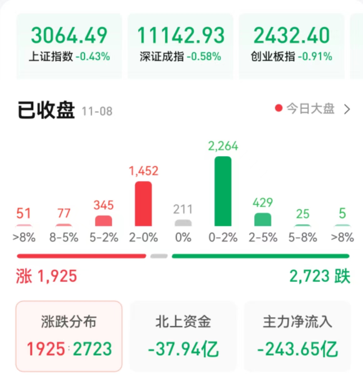 周二(11月8日),A股三大指數(shù)震蕩回落。截至收盤,上證指數(shù)跌0.43%報(bào)3064.49點(diǎn),深證成指跌0.58%報(bào)11142.93點(diǎn),創(chuàng)業(yè)板指跌0.91%報(bào)2432.4點(diǎn),科創(chuàng)50指數(shù)跌0.91%;兩市合計(jì)成交8358億元,北向資金凈賣出37.94億元;總體來(lái)看,A股個(gè)股跌多漲少。
