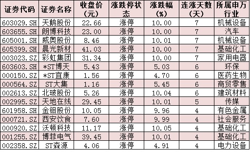 表:連續(xù)上漲4日且今日收盤漲停個(gè)股情況: