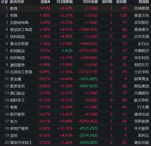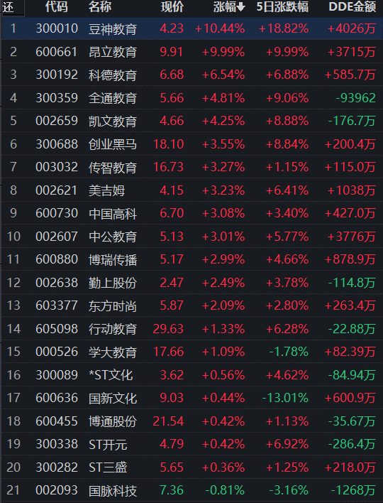 從早盤表現(xiàn)強(qiáng)勢(shì)的教育行業(yè)看,截至11月16日11:30,該行業(yè)交易中的21只個(gè)股有20只上漲,其中3只漲幅超5%。從資金流向看,該行業(yè)今天上午大單資金凈流入額達(dá)1.39億元,居行業(yè)第8位。