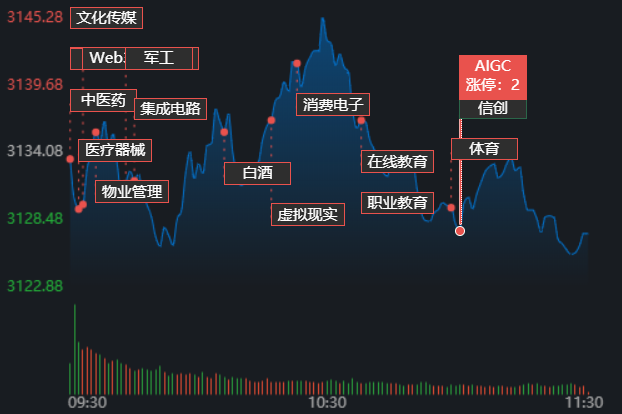 11月16日早盤,A股市場(chǎng)三大指數(shù)震蕩回落,呈滬強(qiáng)深弱格局。截至上午11:30,上證指數(shù)跌0.22%,報(bào)3127.33點(diǎn);深證成指和創(chuàng)業(yè)板指跌幅分別為0.55%和0.59%;滬深兩市合計(jì)成交額6208億元,較上一交易日縮減2.79%??傮w來(lái)看,A股市場(chǎng)個(gè)股漲少跌多,有41只個(gè)股漲停,跌停股1只。