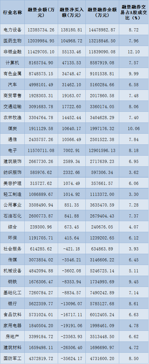 表:11月15日申萬(wàn)一級(jí)行業(yè)兩融交易情況: