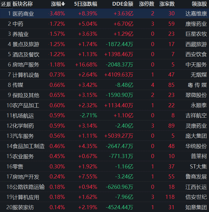 同花順行業(yè)方面,截至11月17日11:30,76類行業(yè)中24類上漲,占比31.58%,其中,醫(yī)藥商業(yè)漲幅居首,達(dá)3.48%。煤炭開采加工跌幅居首,達(dá)2.71%。
