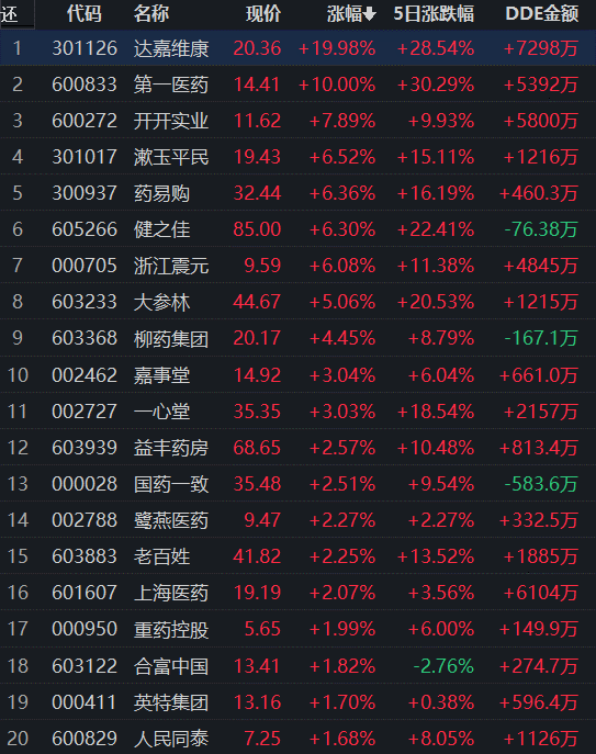 對于醫(yī)藥板塊的投資機(jī)會,東吳證券表示,疫情防控二十條顯示,科學(xué)精準(zhǔn)防控疫情將是趨勢所向,利于宏觀經(jīng)濟(jì)恢復(fù)、利于醫(yī)美及藥店等消費(fèi)醫(yī)療復(fù)蘇,但同時(shí)新冠引起的并發(fā)癥相應(yīng)的藥物需求也將大幅提升,如呼吸道止咳藥、退熱藥等;另外居家自測的抗原需求也將明顯。相關(guān)上市公司將會受益比較明顯。新冠肺炎疫情作用下,藥店板塊業(yè)績表現(xiàn)更加亮眼。展望未來,藥店板塊仍將在行業(yè)集中度提升、連鎖化率提升的趨勢下穩(wěn)健增長。一方面,頭部連鎖藥店公司在資本助推下,穩(wěn)步推進(jìn)在全國的復(fù)制擴(kuò)張,同時(shí)精細(xì)化管理推動內(nèi)生性增長加快。