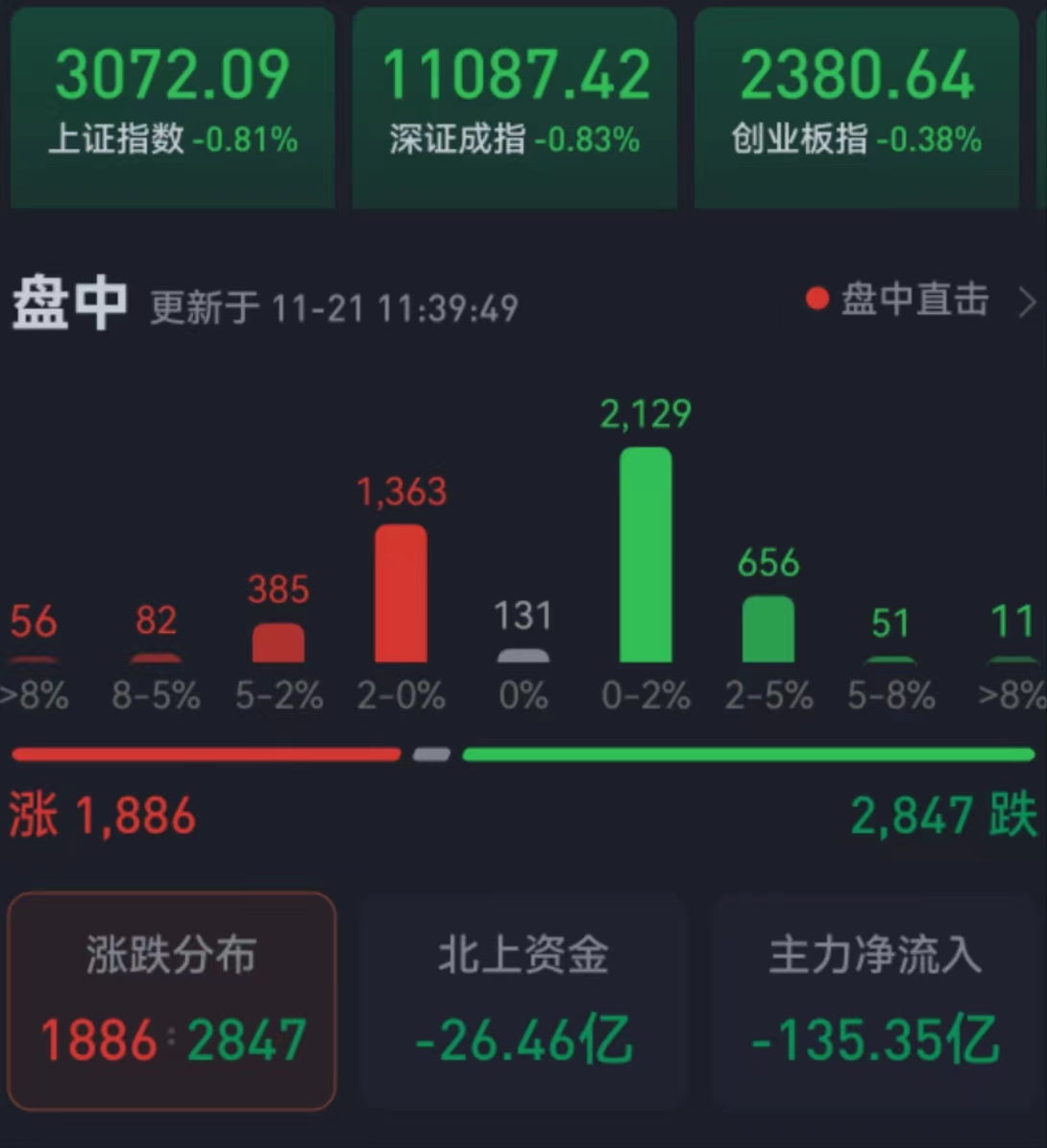 周一(11月21日),三大股指震蕩走弱,全線收綠。截至上午收盤,上證指數(shù)跌幅達0.81%,報3072.09點;深證成指和創(chuàng)業(yè)板指跌幅分別為0.83%和0.38%;滬深兩市合計成交額5470.8億元,總體來看,兩市個股跌多漲少。