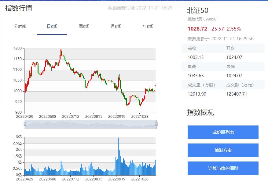 11月21日,北證50成份指數(shù)發(fā)布實時行情(以下簡稱“北證50”),上線首日實現(xiàn)開門紅,北證50以1024.07點開盤,最高上探至1033.65點,最低為1024.07點,報收1028.72點,漲幅達2.55%。