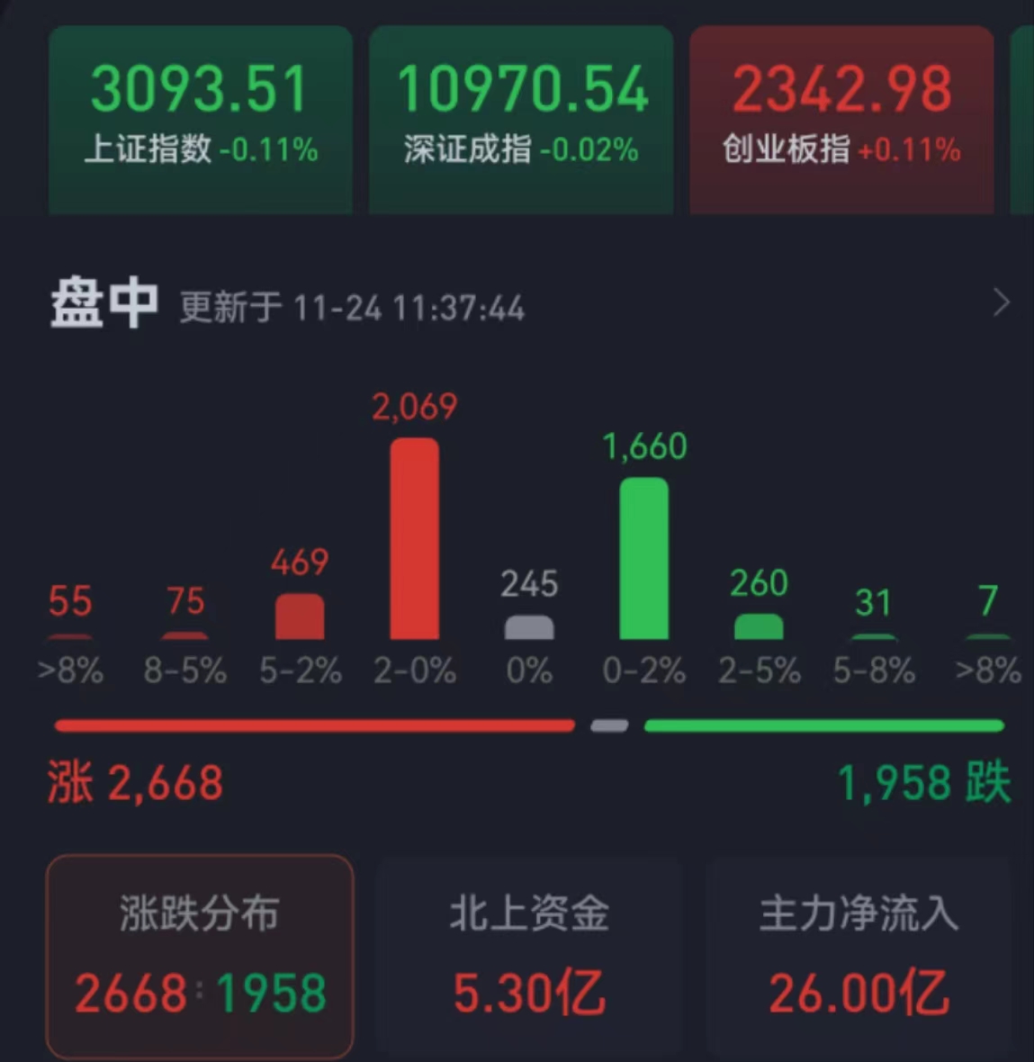 周四(11月24日),三大股指沖高后,震蕩分化,漲跌不一。截至上午收盤,上證指數(shù)跌幅達(dá)0.11%,報(bào)3093.51點(diǎn);深證成指跌幅為0.02%,創(chuàng)業(yè)板指漲幅為0.11%;滬深兩市合計(jì)成交額4730.94億元,總體來看,兩市個(gè)股漲多跌少。