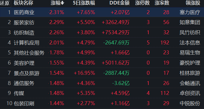 同花順行業(yè)方面,截至12月2日11:30,76類行業(yè)中49類上漲,占比64.47%,其中,醫(yī)藥商業(yè)行業(yè)漲幅居首,達(dá)2.31%,服裝家紡、紡織制造和計(jì)算機(jī)應(yīng)用緊隨其后,漲幅均超2%。貴金屬跌幅居首,達(dá)2.05%。