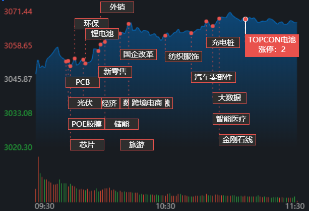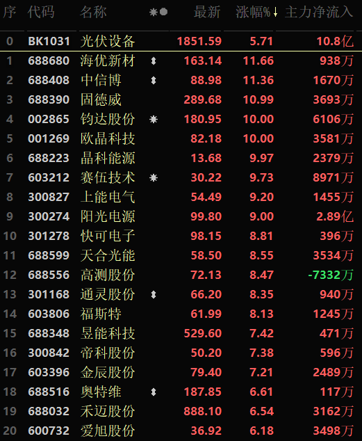 從早盤表現(xiàn)強勢的光伏設(shè)備行業(yè)看,交易中的48只成份股有47只上漲,其中,26只漲幅超5%。資金流向看,光伏設(shè)備行業(yè)大單資金凈流入額達10.8億元,居行業(yè)第1位。