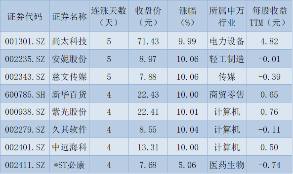 表:連續(xù)上漲4日且今日收盤(pán)漲停股一覽