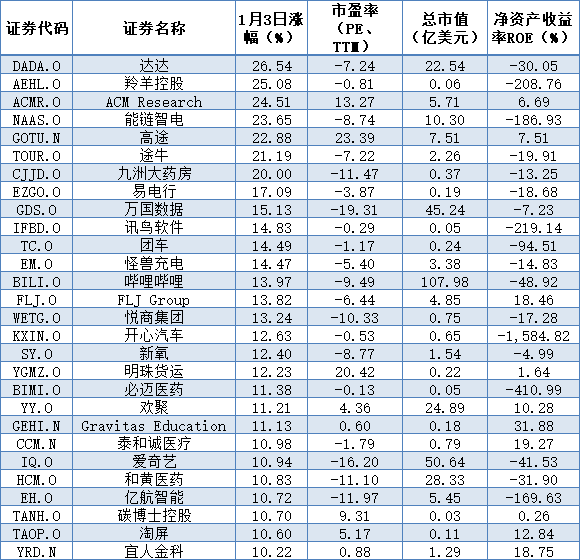 值得關(guān)注的是,在美股走低之際,中概股逆勢走高,截至1月3日收盤,納斯達(dá)克中國金龍指數(shù)漲3.76%,直播概念、網(wǎng)絡(luò)視頻、在線旅游等概念領(lǐng)漲,途牛漲幅21.19%,嗶哩嗶哩、歡聚、愛奇藝漲幅超10%。記者通過梳理各大機(jī)構(gòu)研報以及對專家采訪發(fā)現(xiàn),三方面因素推動中概股走強(qiáng):