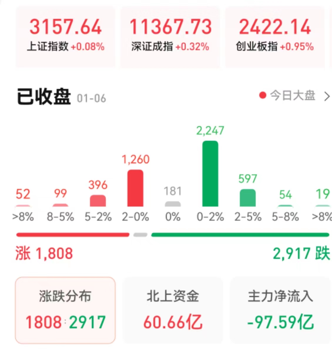 周五(1月6日),A股三大指數(shù)震蕩上行,全線飄紅。截至收盤,上證指數(shù)微漲0.08%報(bào)3157.64點(diǎn),深證成指漲0.32%報(bào)11367.73點(diǎn),創(chuàng)業(yè)板指漲0.95%報(bào)2422.14點(diǎn),科創(chuàng)50指數(shù)漲0.77%;兩市合計(jì)成交8380億元,北向資金凈買入60.66億元。漲停個(gè)股達(dá)36只,跌停個(gè)股達(dá)14只。