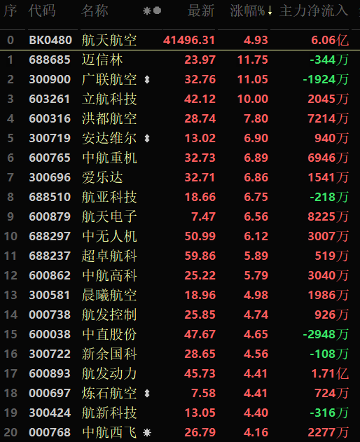 從早盤(pán)表現(xiàn)強(qiáng)勢(shì)的航天航空行業(yè)看,交易中的38只成份股全線上漲,其中立航科技封漲停板。資金流向看,航天航空行業(yè)大單資金凈流入額為6.06億元,居行業(yè)第7位。