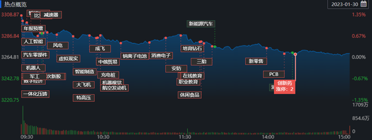 從概念板塊來看,東方財富362個概念板塊中,338個上漲,占比93.37%。汽車一體化壓鑄概念領(lǐng)漲,漲幅達(dá)6.38%,此外,AIGC概念、機器視覺和培育鉆石等3個板塊漲幅超4%。下跌方面,在線旅游領(lǐng)跌,跌幅達(dá)1.78%。