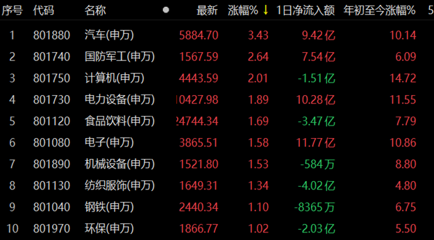 漲停股方面,今日有95只個股以漲停價報收,其中,有10只個股股價已連續(xù)上漲超過5個交易日。從申萬一級行業(yè)看,汽車行業(yè)漲停股數(shù)量居首,為17只,計算機與機械設(shè)備緊隨其后,漲停股數(shù)分別為15只和10只。跌停方面,有10只個股跌停價報收。