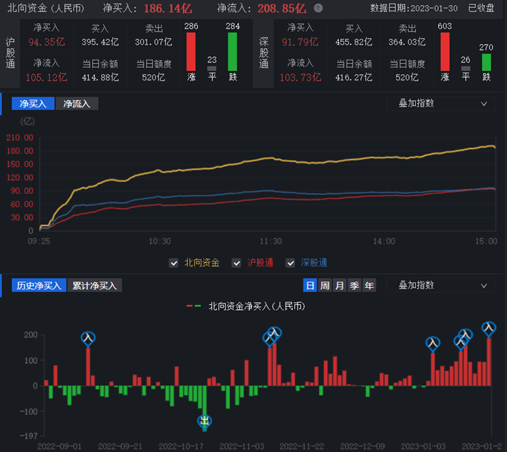 1月30日,A股三大指數(shù)高開震蕩,午盤后在權(quán)重股帶動下出現(xiàn)回落過程。截至收盤,上證指數(shù)漲0.14%報3269.32點;深證成指漲0.98%報12097.76點,創(chuàng)業(yè)板指漲1.08%報2613.89點,A股合計成交額10617.69億元,較前一交易日增長41.78%,北向資金凈買入186.14億元,這是北向資金連續(xù)第14個交易日凈買入,同時,單日凈買入額也創(chuàng)2021年12月以來新高??傮w上看,A股個股漲多跌少,有3824只上漲,1114只下跌。