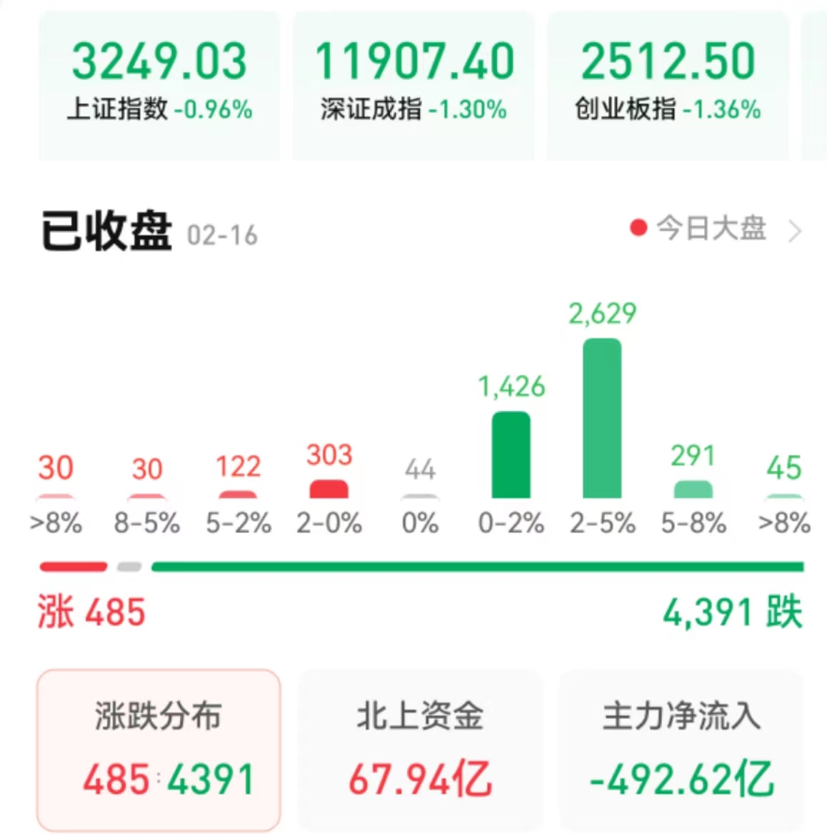 周四(2月16日),A股三大指數(shù)震蕩回落,全線下跌。截至收盤,上證指數(shù)跌0.96%報(bào)3249.03點(diǎn),深證成指跌1.30%報(bào)11907.4點(diǎn),創(chuàng)業(yè)板指跌1.36%報(bào)2512.5點(diǎn);兩市合計(jì)成交金額達(dá)11930億元,自2月2日以來首次突破萬億元。北向資金凈買入67.94億元??傮w上看,兩市個(gè)股跌多漲少,近4400只個(gè)股下跌。其中,漲停個(gè)股達(dá)23只,跌停個(gè)股達(dá)4只。