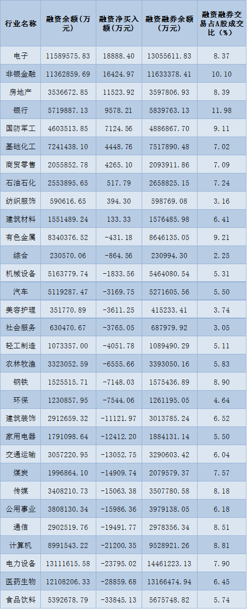 表:2月24日申萬(wàn)一級(jí)行業(yè)兩融交易情況: