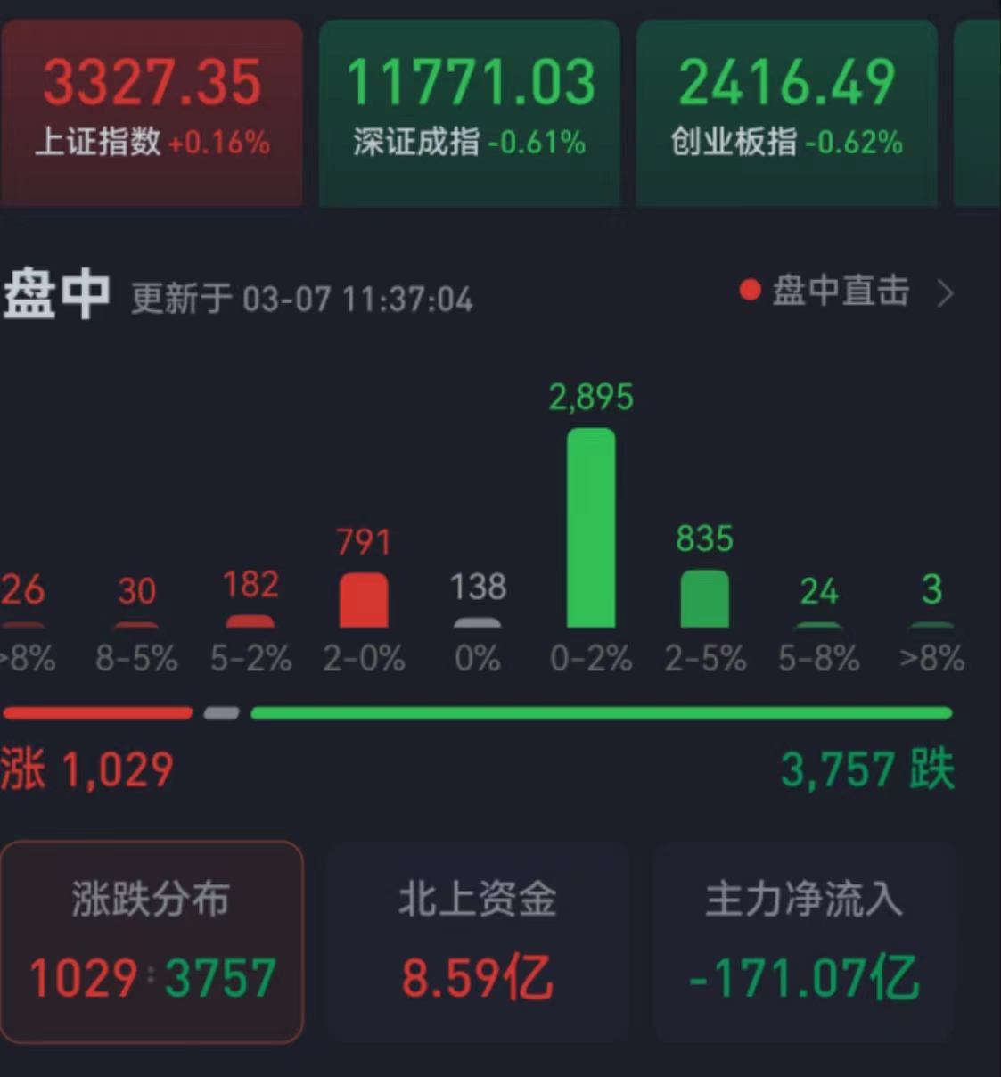 周二(3月7日),三大股指繼續(xù)震蕩分化,漲跌不一。截至上午收盤,上證指數(shù)漲幅達0.16%,報3327.35點;深證成指和創(chuàng)業(yè)板指跌幅分別為0.61%和0.62%;滬深兩市合計成交額5476.8億元,總體來看,兩市個股跌多漲少。其中,超3700只個股下跌。