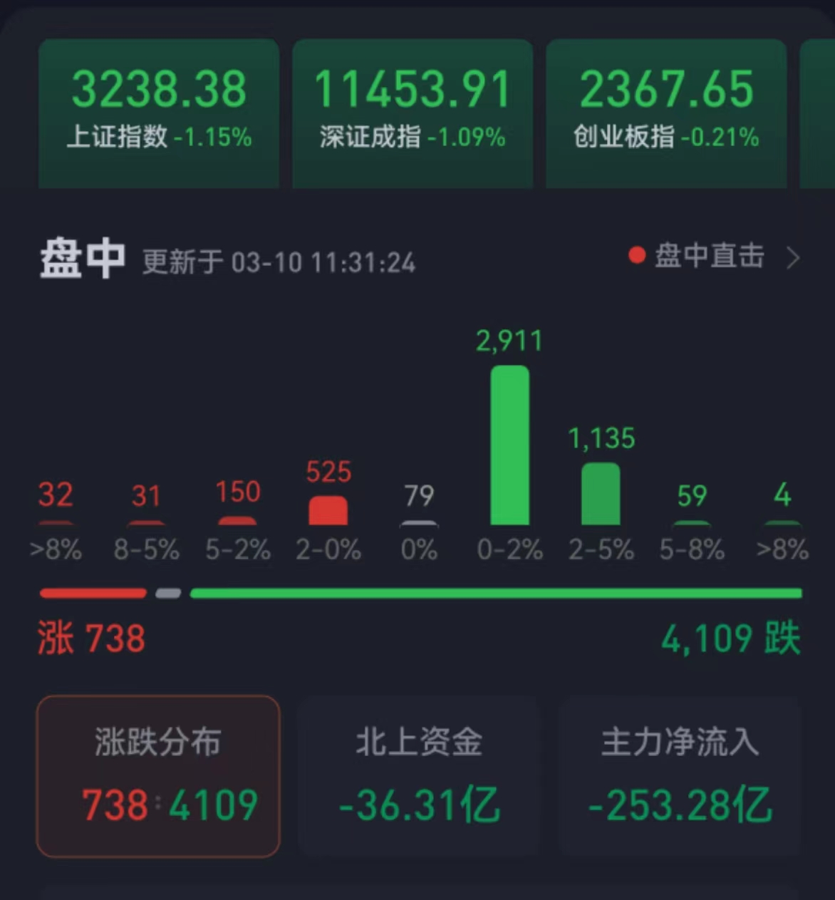 周五(3月10日),三大股指繼續(xù)震蕩回落。截至上午收盤,上證指數(shù)跌幅達(dá)1.15%,報(bào)3238.38點(diǎn);深證成指跌幅為1.09%,創(chuàng)業(yè)板指跌幅達(dá)0.21%;滬深兩市合計(jì)成交額5127.1億元,總體來看,兩市個股跌多漲少,超4000只個股出現(xiàn)下跌。