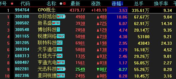 具體看,截至3月23日上午收盤,CPO概念板塊再度上行,漲幅居首達3.53%。其中,中際旭創(chuàng)漲幅超10%。