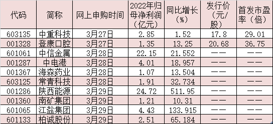 3月27日,首批滬深主板注冊制新股正式開始網上申購。首批10只滬深主板注冊制新股,中重科技、登康口腔在本周一(3月27日)申購;中電港、常青科技、中信金屬、海森藥業(yè)將在本周二(3月28日)申購;柏誠股份、江鹽集團、南礦集團、陜西能源將在本周三(3月29日)申購。