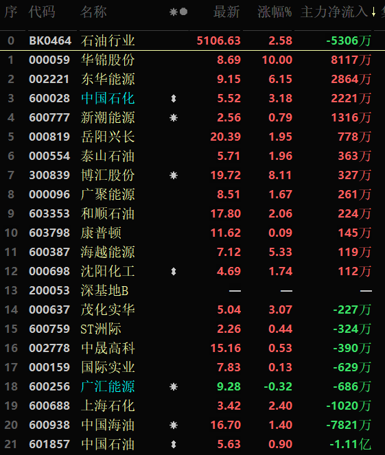 從早盤表現(xiàn)強(qiáng)勢(shì)的石油行業(yè)看,該行業(yè)交易中的20只成份股中有19只上漲,其中,有4只個(gè)股漲幅超5%。資金方面,有-5306萬元大單資金凈流入該行業(yè),居各行業(yè)資金凈流入排名第33位。