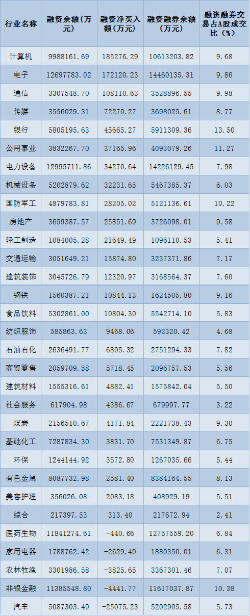 表:3月27日申萬一級(jí)行業(yè)兩融交易情況: