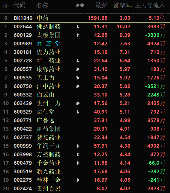 從早盤表現(xiàn)強(qiáng)勢(shì)的中藥行業(yè)看,該行業(yè)交易中的73只成分股中有70只上漲,其中,有11只個(gè)股漲幅超5%。資金方面,有5.10億元大單資金凈流入該行業(yè),居各行業(yè)第3位。