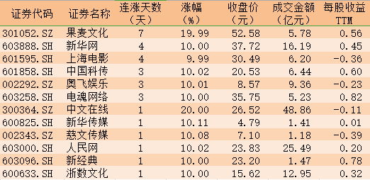 漲停股方面,今日有33只個股以漲停價報收,有13只個股屬傳媒行業(yè),占比近四成,其中中文在線、果麥文化20CM漲停,奧飛娛樂3連板。