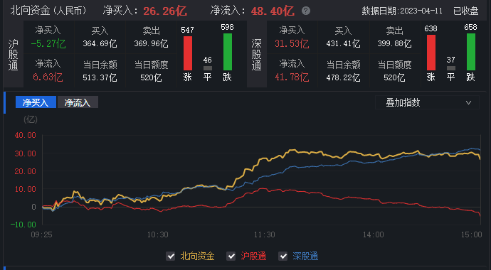 4月11日,截至收盤,上證指數(shù)跌0.05%報3313.57點,深證成指漲0.04%報11877.15點,創(chuàng)業(yè)板指跌0.17%報2439.40點,A股合計成交額10834.59億元;北向資金全天凈買入26.26億元,其中滬股通凈賣出5.27億元,深股通凈買入31.53億元。今日A股中有2295只上漲,2485只下跌。