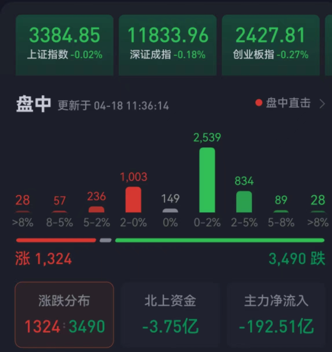 周二(4月18日),三大股指繼續(xù)震蕩整理。截至上午收盤,上證指數(shù)跌幅達(dá)0.02%,報3384.85點;深證成指和創(chuàng)業(yè)板指跌幅分別為0.18%和0.27%;滬深兩市合計成交額6672.9億元,總體來看,兩市個股跌多漲少。