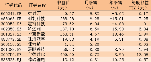 表:鋰電池板塊A股本月漲幅前十位個(gè)股