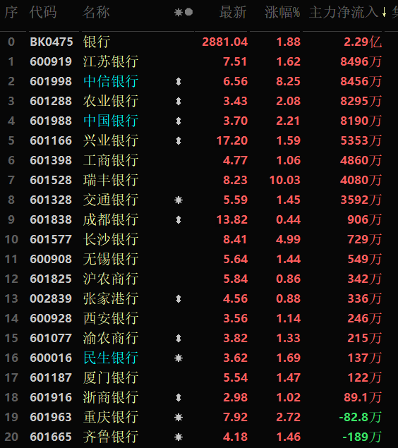 從早盤表現(xiàn)強勢的銀行行業(yè)看,交易中的42只成份股全線上漲,其中,有3只個股漲幅超5%。資金方面,有2.29億元大單資金凈流入該行業(yè),居各行業(yè)第2位。
