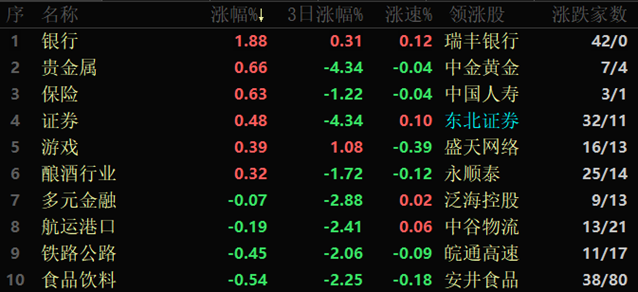 東方財富行業(yè)方面,截至4月25日11:30,86個行業(yè)板塊中6個上漲,占比6.98%,其中,銀行行業(yè)漲幅居前,達(dá)1.88%。下跌方面,能源金屬行業(yè)跌幅居首,達(dá)6.53%,此外,包括電池、工程咨詢服務(wù)和旅游酒店等在內(nèi)的12個行業(yè)跌幅超3%。