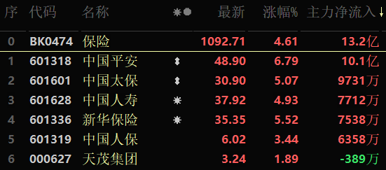 從早盤表現(xiàn)強勢的保險行業(yè)看,交易中的6只成份股全線上漲,其中,有3只個股漲幅超5%。資金方面,有13.2億元大單資金凈流入該行業(yè),居各行業(yè)第1位。