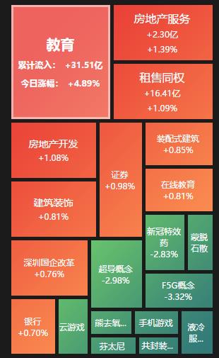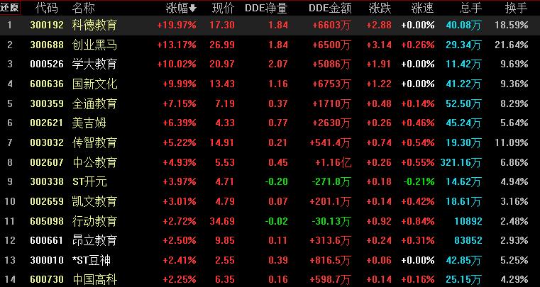 具體看,截至5月5日上午收盤,教育板塊漲幅居首達(dá)4.89%。其中,科德教育20CM漲停,創(chuàng)業(yè)黑馬、學(xué)大教育、國(guó)新文化等多只概念股漲幅均超9%。