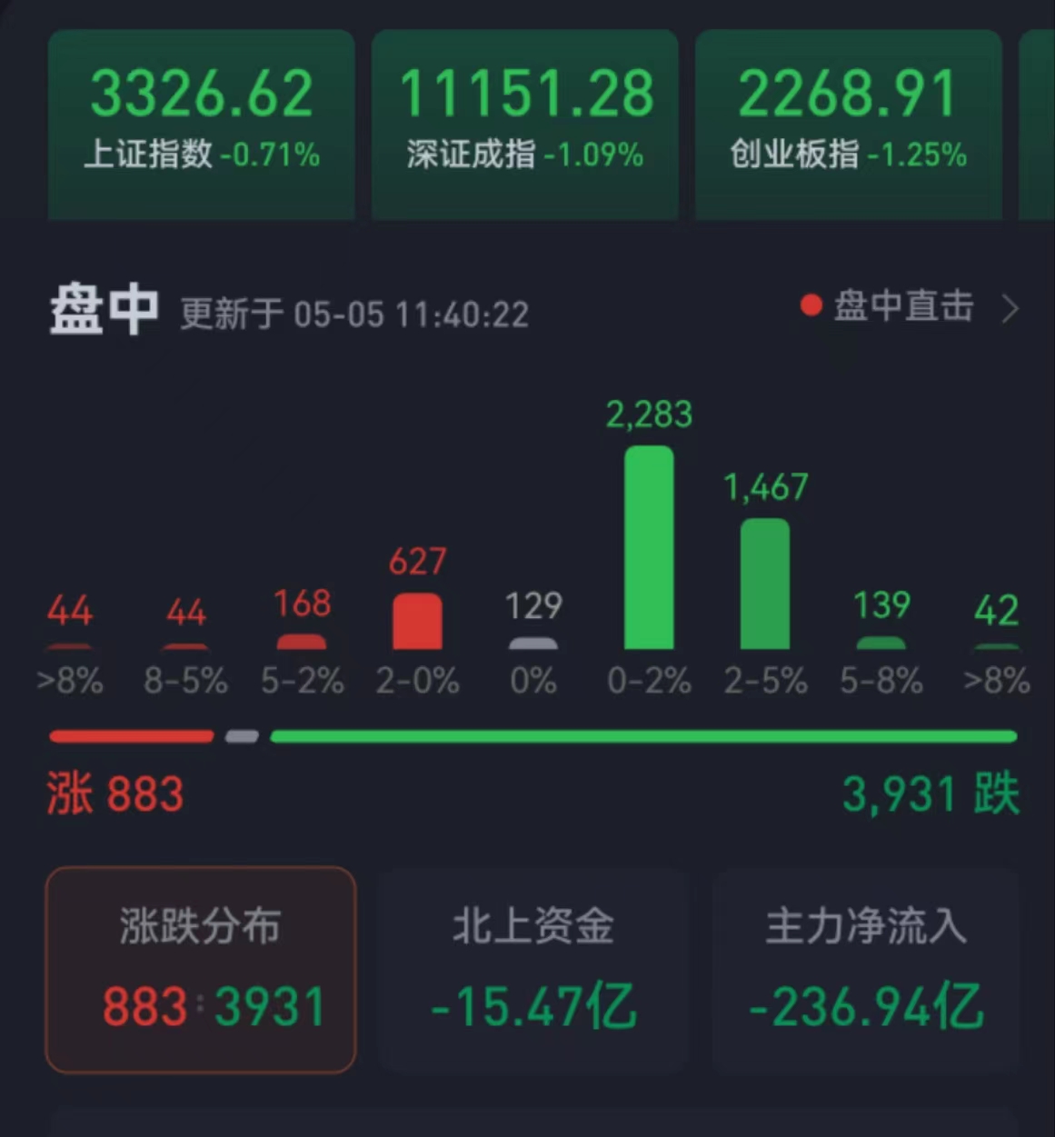 周五(5月5日),三大股指震蕩回落。截至上午收盤,上證指數(shù)跌幅達(dá)0.71%,報(bào)3326.62點(diǎn);深證成指和創(chuàng)業(yè)板指跌幅分別為1.09%和1.25%;滬深兩市合計(jì)成交額7222.9億元,總體來(lái)看,兩市個(gè)股跌多漲少。