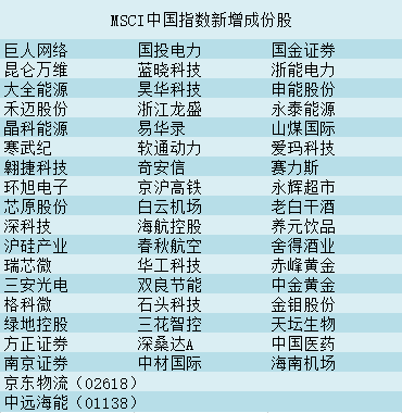 新納入MSCI中國指數的53只成份股中,包含51只A股與2只港股(中遠海能、京東物流),總市值排在前三位的分別為京滬高鐵、晶科能源、大全能源。