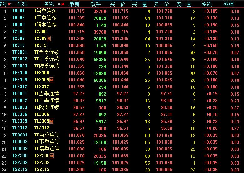周五,國(guó)債期貨全線收漲,30年期主力合約漲0.23%,10年期主力合約漲0.13%,5年期主力合約漲0.10%,2年期主力合約漲0.03%。