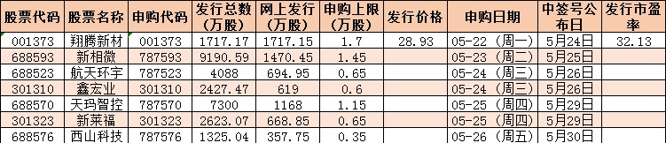 根據(jù)發(fā)行安排,下周有7只新股發(fā)行,其中科創(chuàng)板有4只。5月22日發(fā)行的是翔騰新材;5月23日發(fā)行的是新相微;5月24日發(fā)行的是航天環(huán)宇、鑫宏業(yè);5月25日發(fā)行的是新萊福、天瑪智控;5月26日發(fā)行的是西山科技。