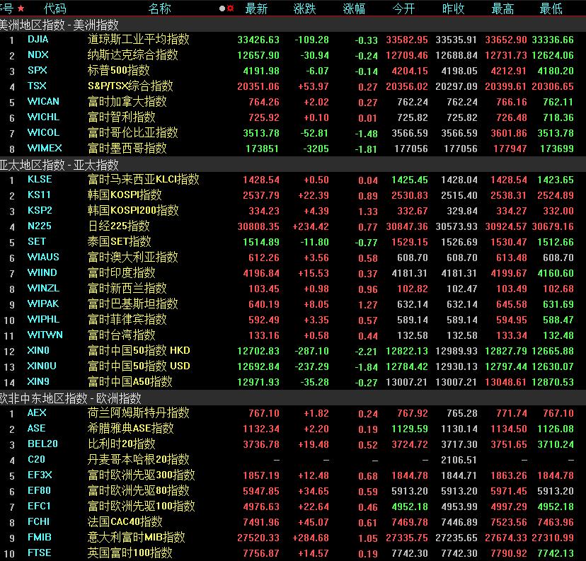 周五,美國(guó)三大股指小幅收跌,道瓊斯工業(yè)指數(shù)跌0.33%報(bào)33426.63點(diǎn),本周累計(jì)上漲0.38%;標(biāo)普500指數(shù)跌0.14%報(bào)4191.98點(diǎn),周漲1.65%;納斯達(dá)克指數(shù)跌0.24%報(bào)12657.9點(diǎn),周漲3.04%。